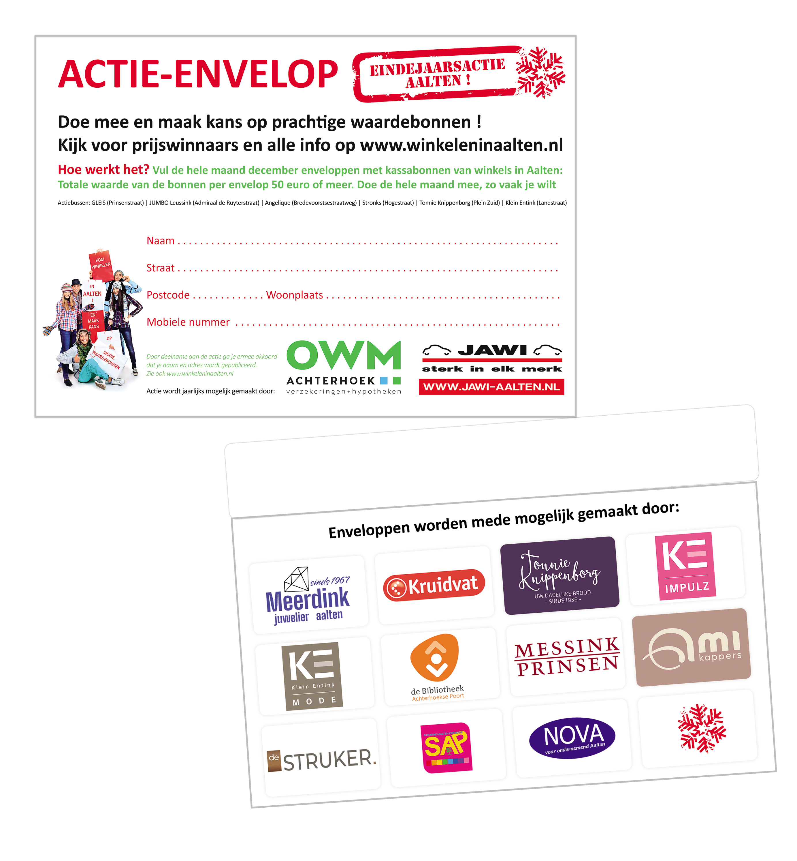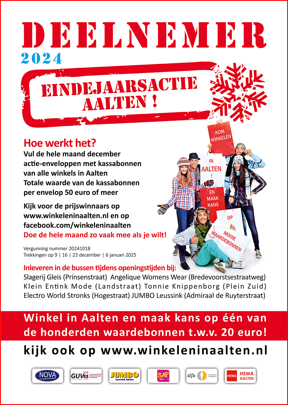 De hele maand december is in Aalten de Eindejaarsactie van de Aaltense Ondernemers. Spaar je kassabonnen vanaf 1 december en maak kans op een van de honderden mooie waardebonnen van maar liefst 20 euro!