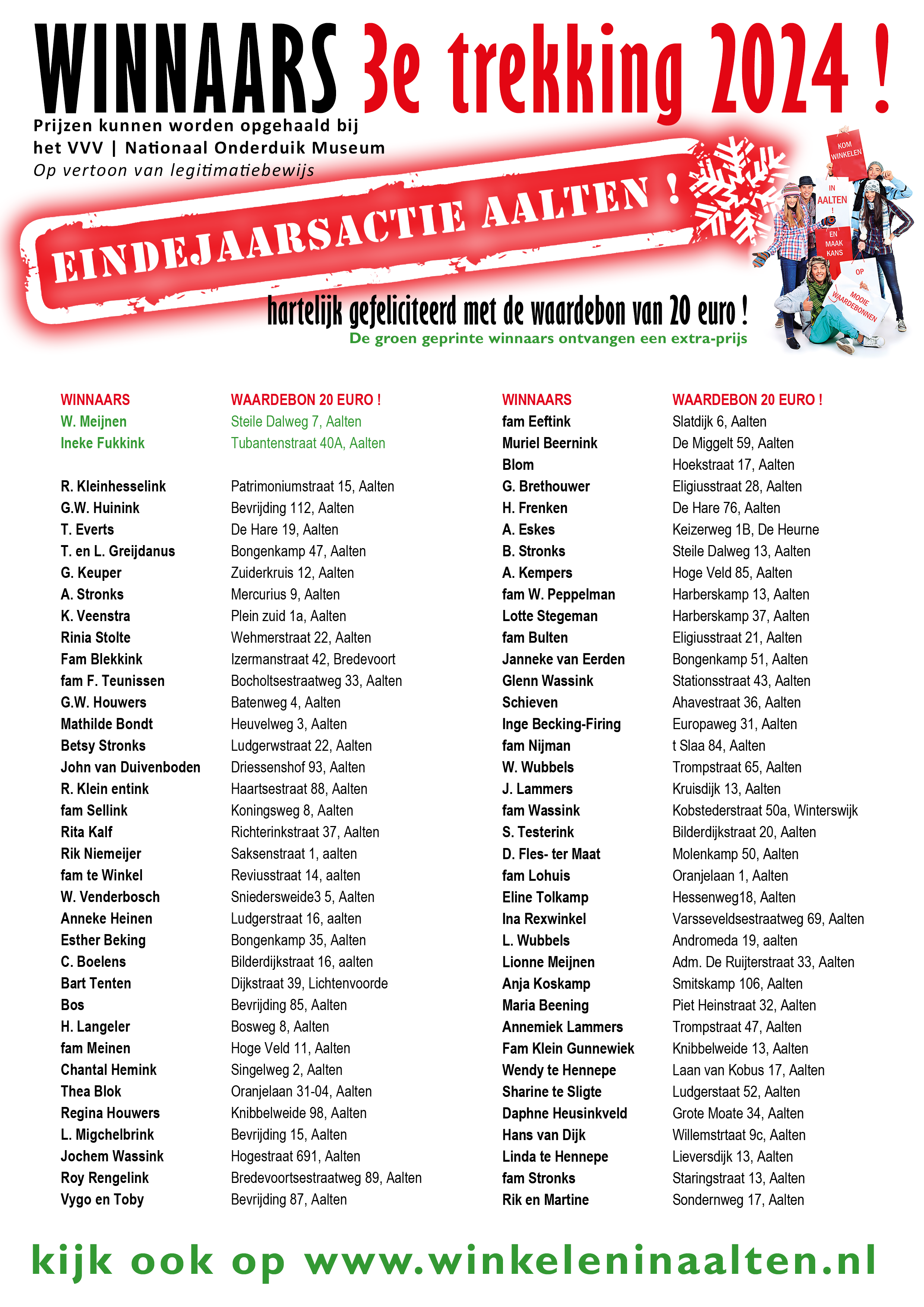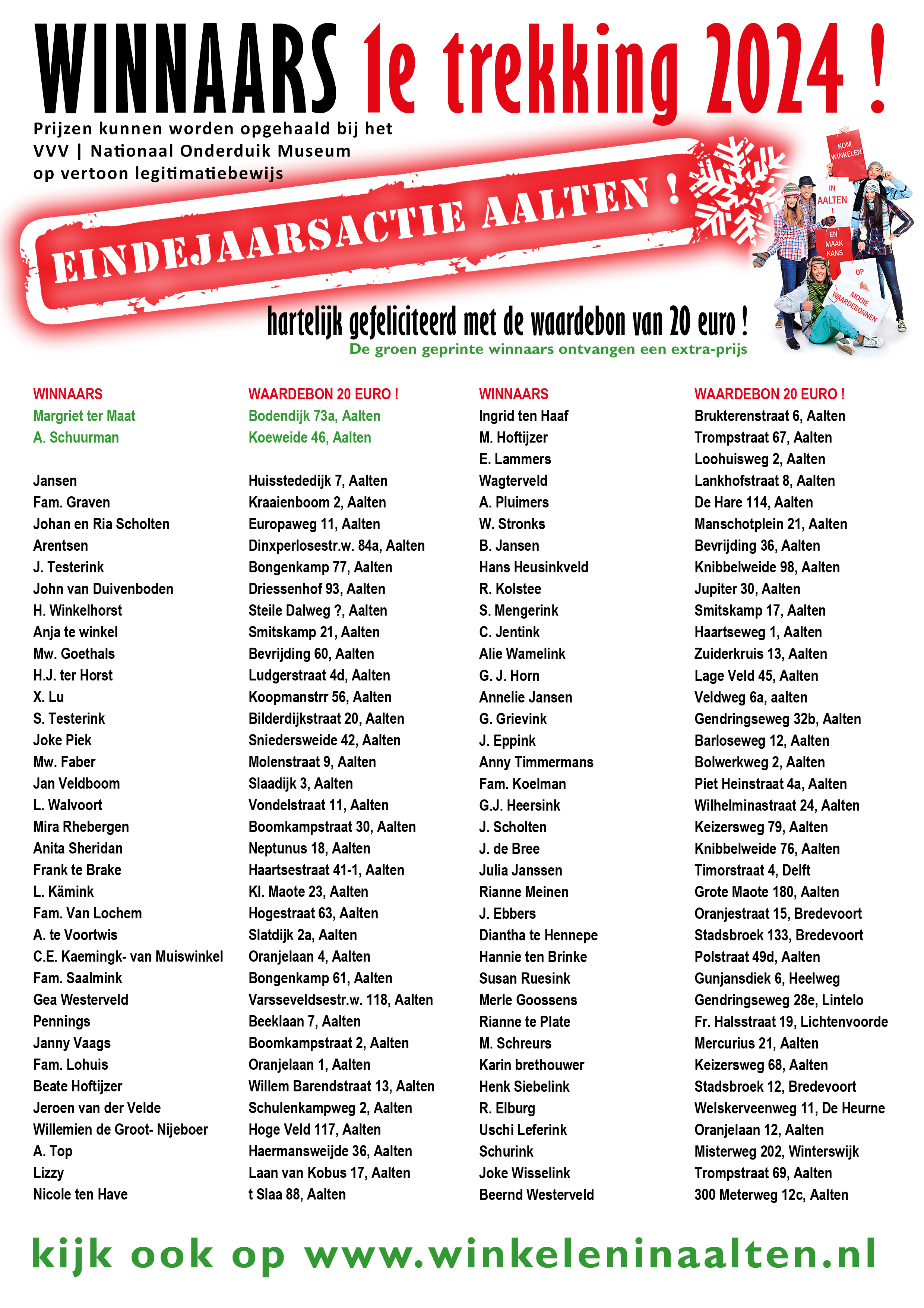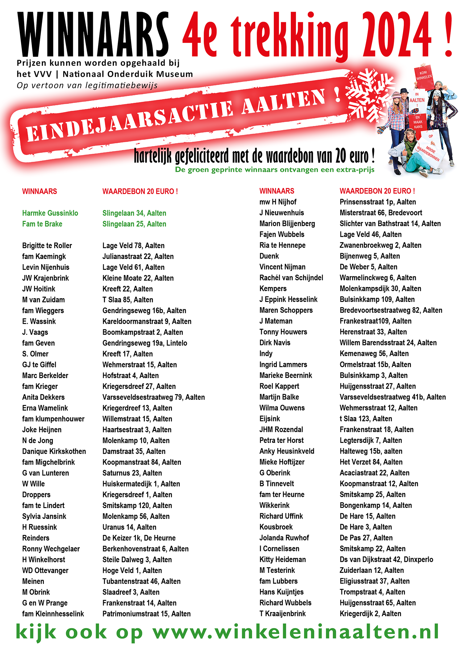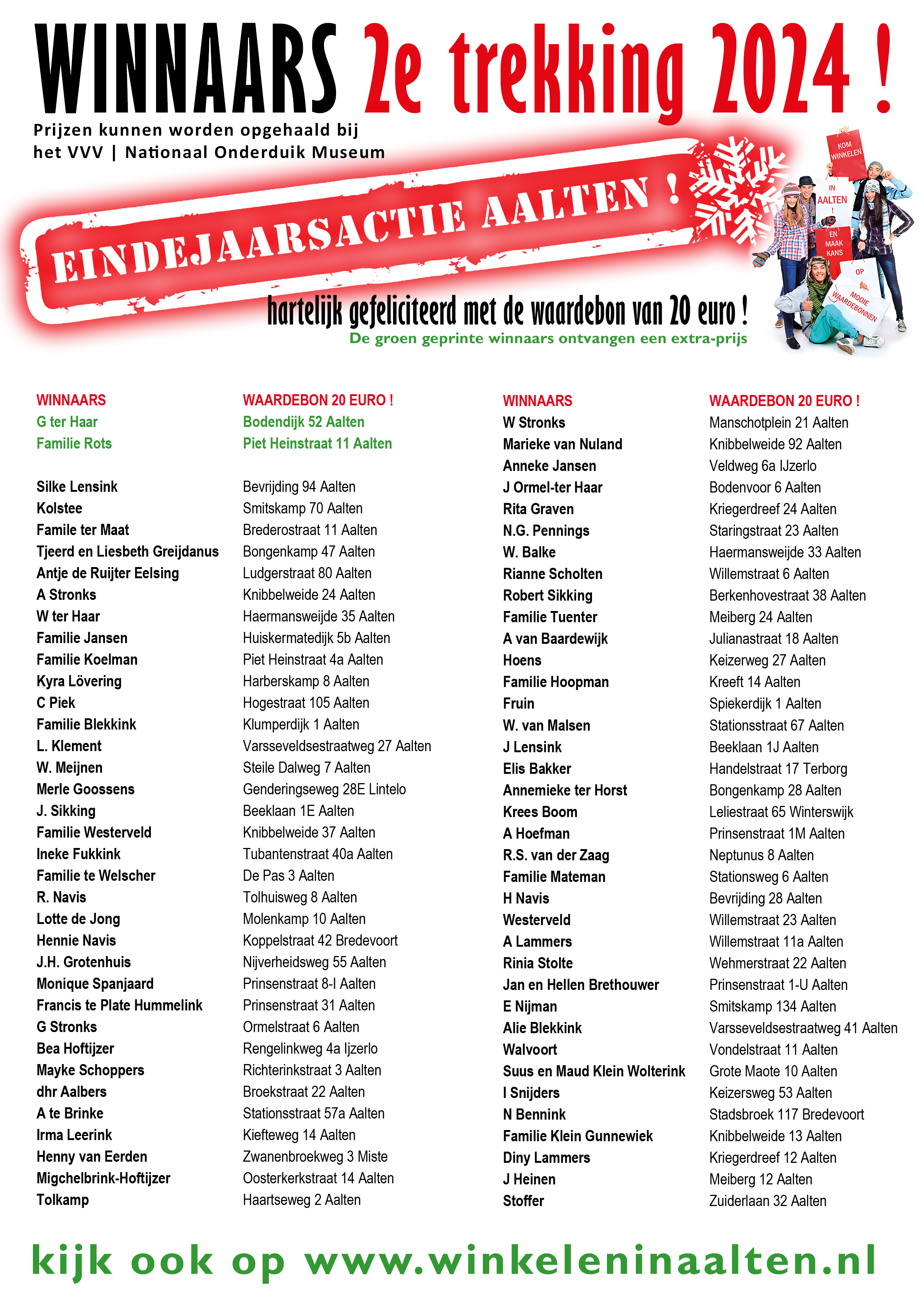 Klanten die in Aalten aankopen doen maken kans op waardebonnen die beschikbaar zijn gesteld door ondernemers uit Aalten. Kassabonnen van alle winkels in Aalten kunnen worden ingeleverd bij deze actie, dus van de slager, drogist, groenteman, bakker, kledingzaak, bloemist, warenhuis en supermarkten. Er zijn drie trekkingen in de maand december, één in januari. De prijswinnaars worden bekend gemaakt op www.winkeleninaalten.nl en op www.wintertijdinaalten.nl en de prijswinnaars kunnen hun prijs ophalen bij het Nationaal Onderduikmuseum / VVV !